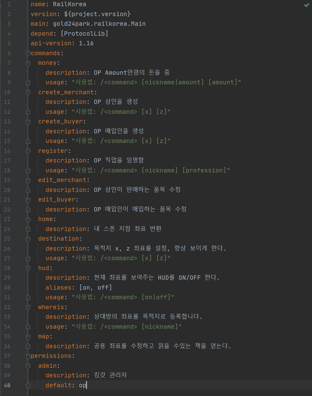 - main: 플러그인 시작시 실행할 파일이 무엇인지에 대한 정의입니다. 저는 gold24park > railkorea에 위치한 Main 파일을 시작지점으로 하기 때문에 저렇게 설정해두었습니다.