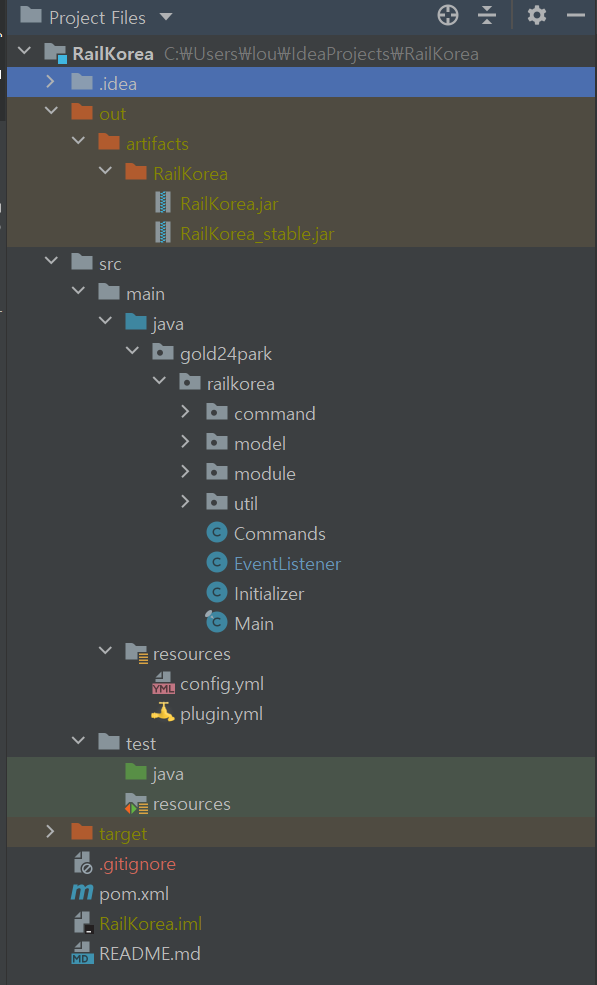 - main: 플러그인 시작시 실행할 파일이 무엇인지에 대한 정의입니다. 저는 gold24park > railkorea에 위치한 Main 파일을 시작지점으로 하기 때문에 저렇게 설정해두었습니다.