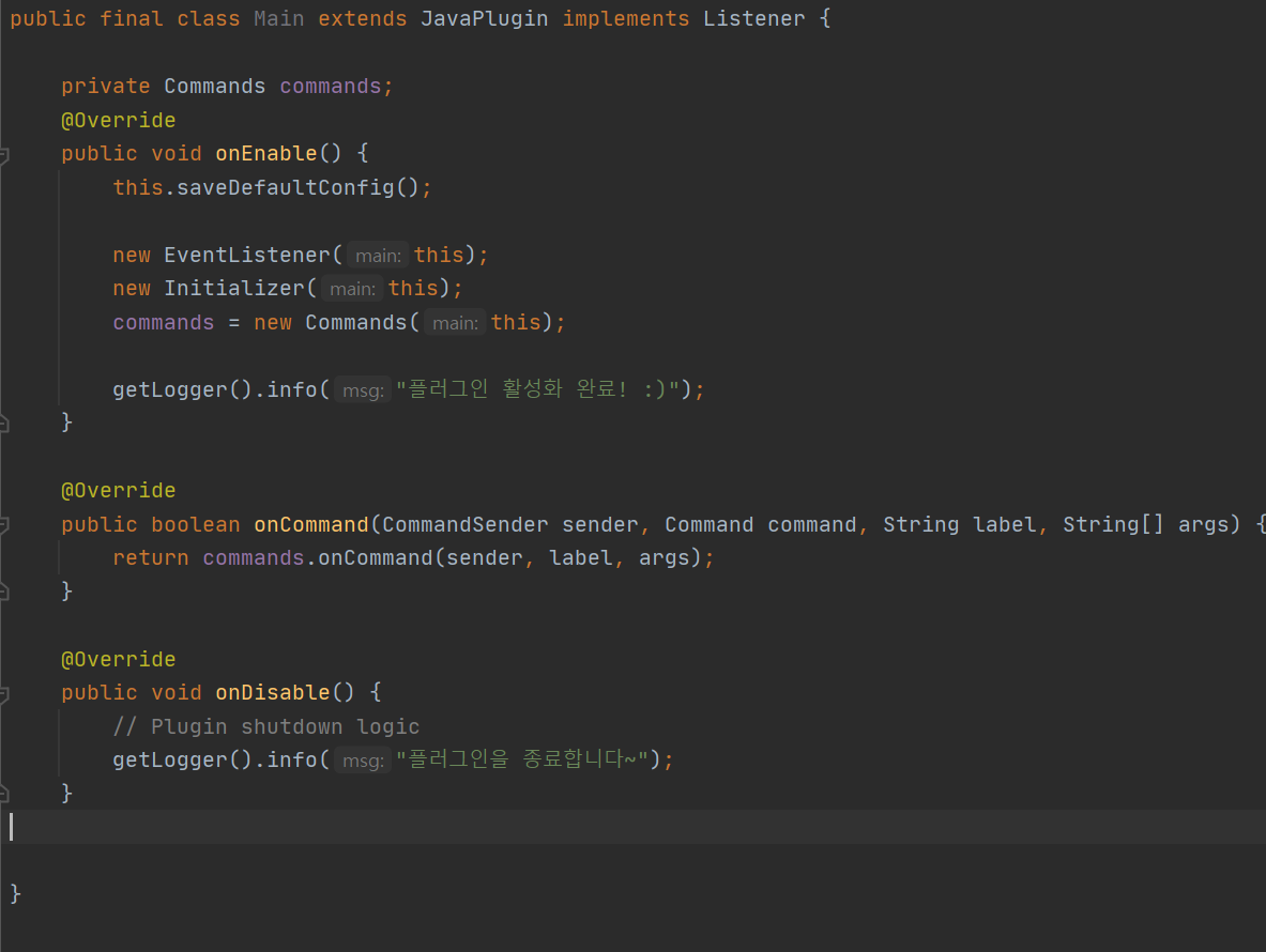반드시 JavaPlugin을 상속 받아야하고, 파일에 보시면 onEnable(), onCommand(), onDisable() 메소드가 override 되어있습니다.