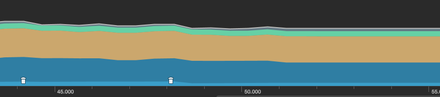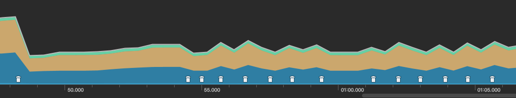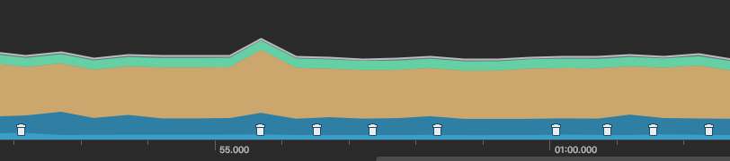 모든 이미지를 로딩하고 아래에서 위까지 스크롤 2번 한 후에 안정된 상태의 메모리 상태다. 아주잠깐 300MB까지 치솟다가 잠잠해진 후 GC가 자주 일어나지는 않았다.