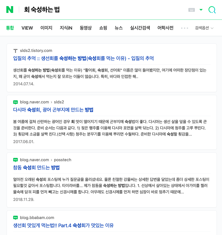 // 검색창에 '회 숙성하는 법'을 치고 엔터키를 누른다.