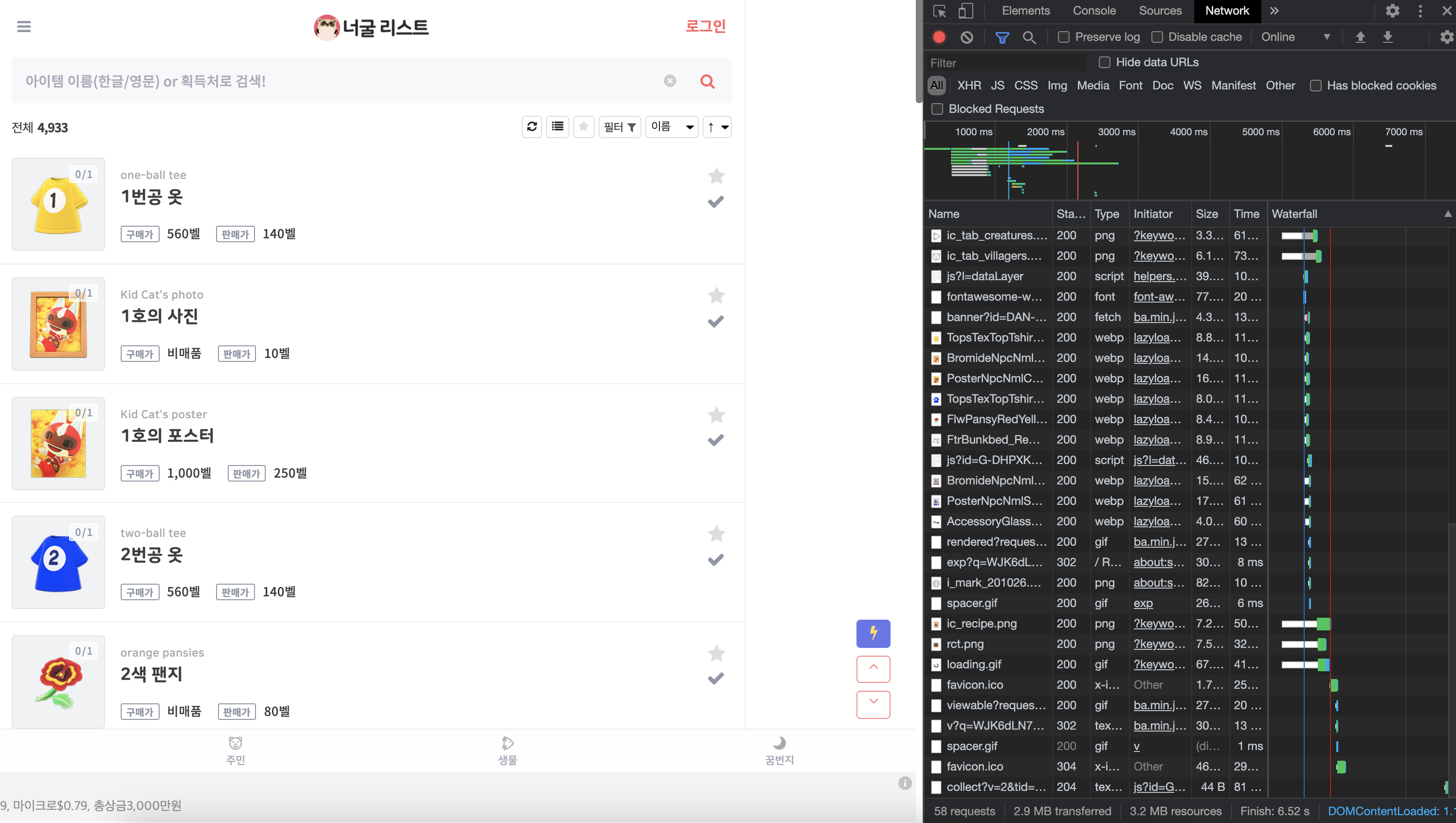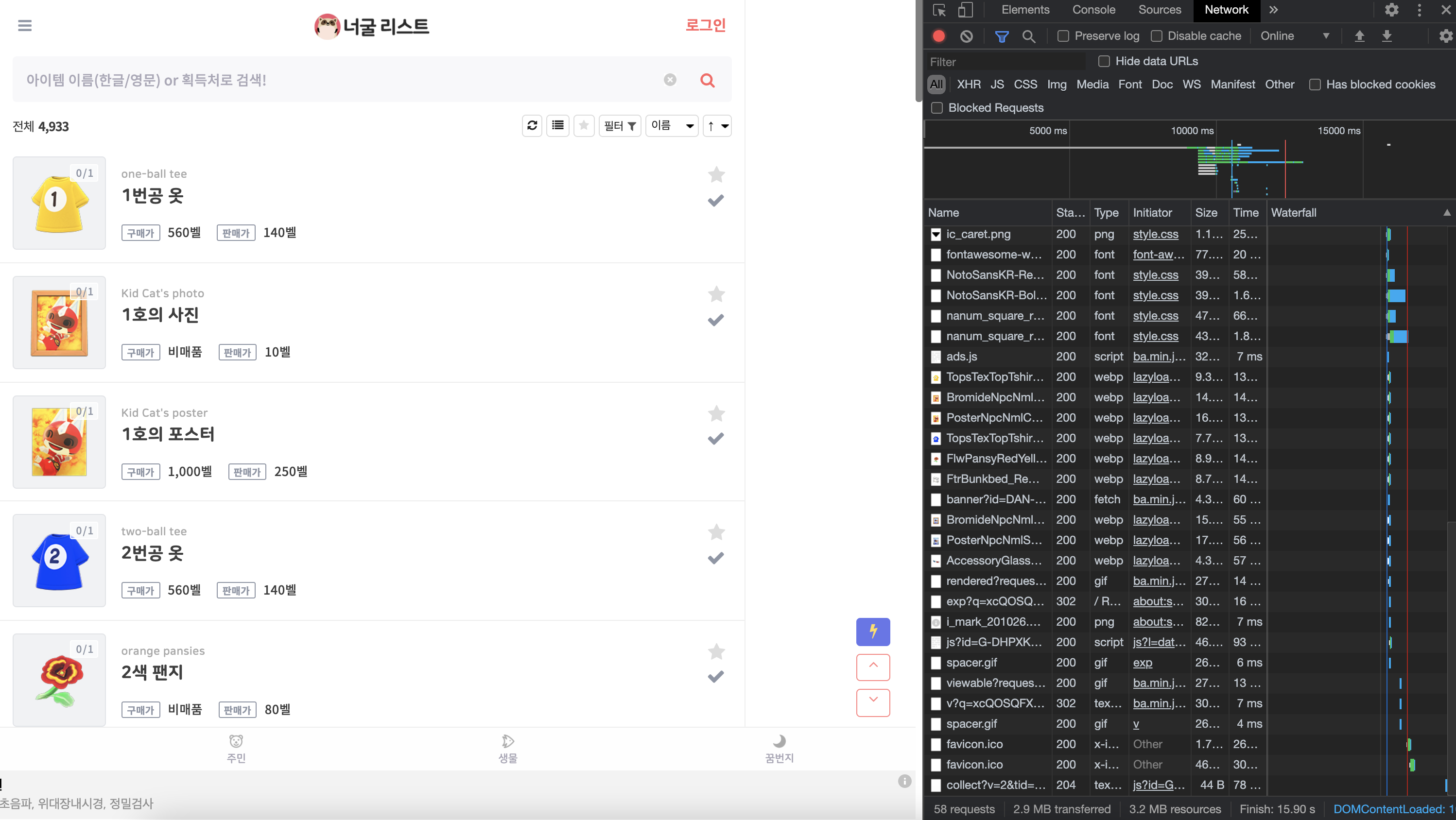 내가 운영하고 있는 동물의 숲 어플인 너굴리스트다. 그냥 컴퓨터에서 이용할때는 견딜만 하지만, 아이폰의 경우 웹뷰로 띄워서 보여주는데 로딩속도가 무지막지하게 느리다. 사진에서 봐도 Finish까지 15.90s. 이럴때 Nginx에서 css/js/image 파일 등을 캐싱 해 두면 좋다는 조언을 얻었다.