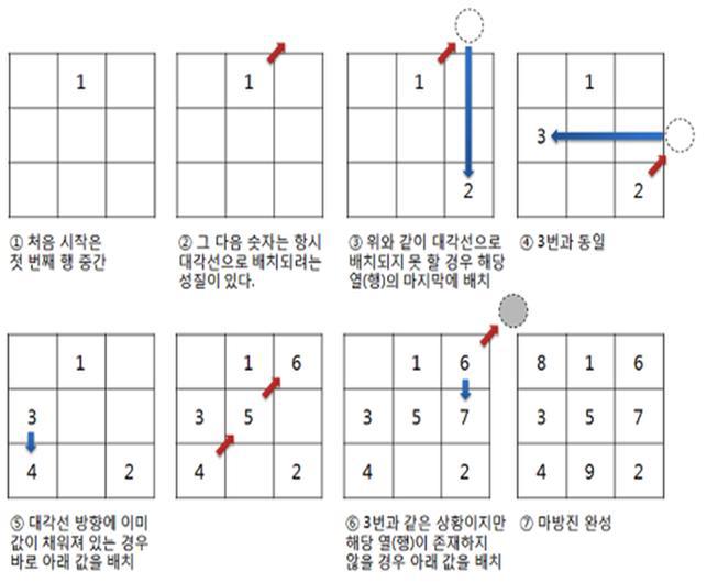 마방진을 그리는 방법은 아래 사진과 같다. 인터넷에 원리라고 떠돌아다니는 건데....원리는 잘 모르겠다 ㅋㅋㅋ 암튼 파이썬으로 마방진 생성기를 만들어 보자. 11차 마방진이든 111차 마방진이든 그릴수 있도록 말이다.