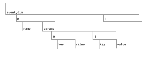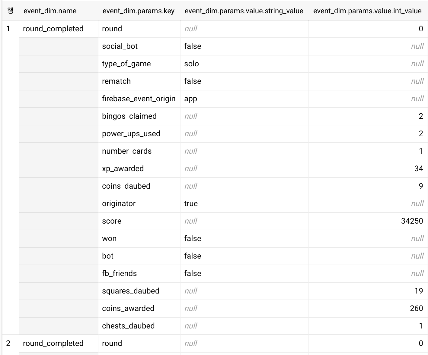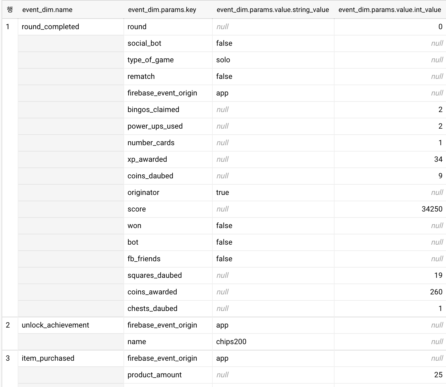 분명 필드는 event_dim 하나 밖에 집어주지 않았지만, event_dim 하위에 name, params 그리고 params 하위에 key-value 쌍이 있는 형태로 되어있기 때문이다.