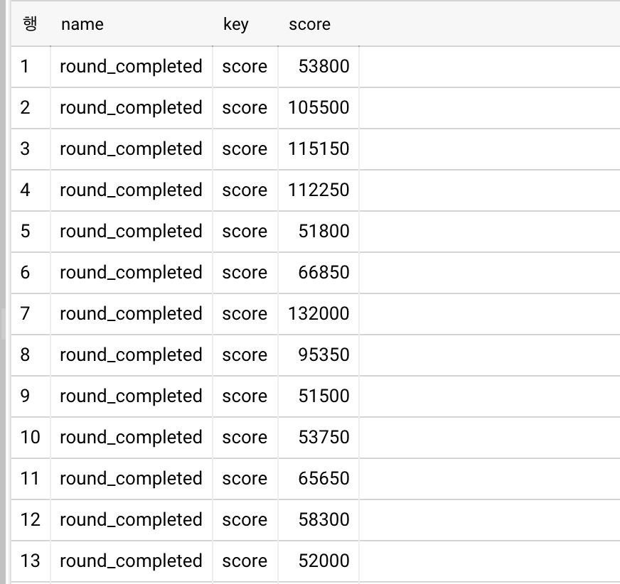 짜잔! 의도대로 event_dim.name이 "round_completed"인 레코드만 걸러졌다.