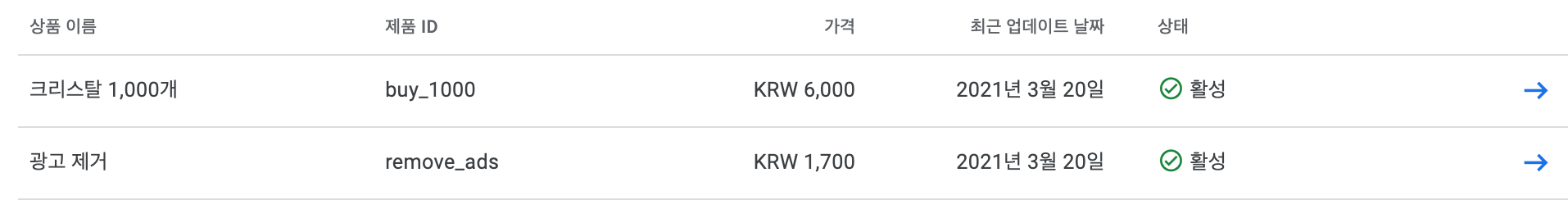 - 소비성 상품: 앱 내의 재화(크리스탈)를 충전, 목숨 충전하는 것과 같이, 충전 식으로 여러번 구매 할 수 있는 형태 |