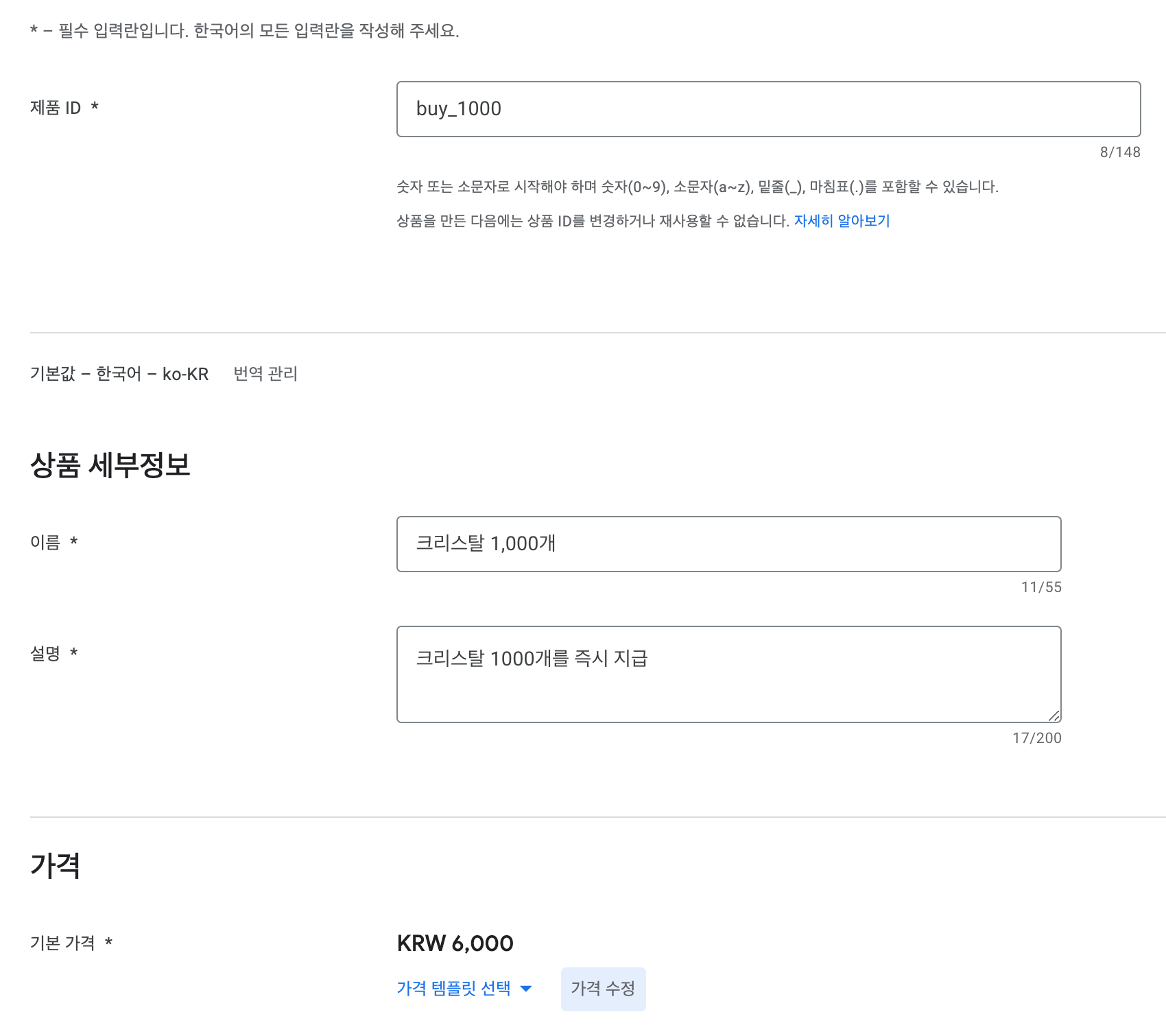 상품 만들기 버튼을 눌러 인앱 상품을 만들 수 있습니다. 저장 후 "활성화" 해야 앱에서 사용할 수 있는 상태가 됩니다.