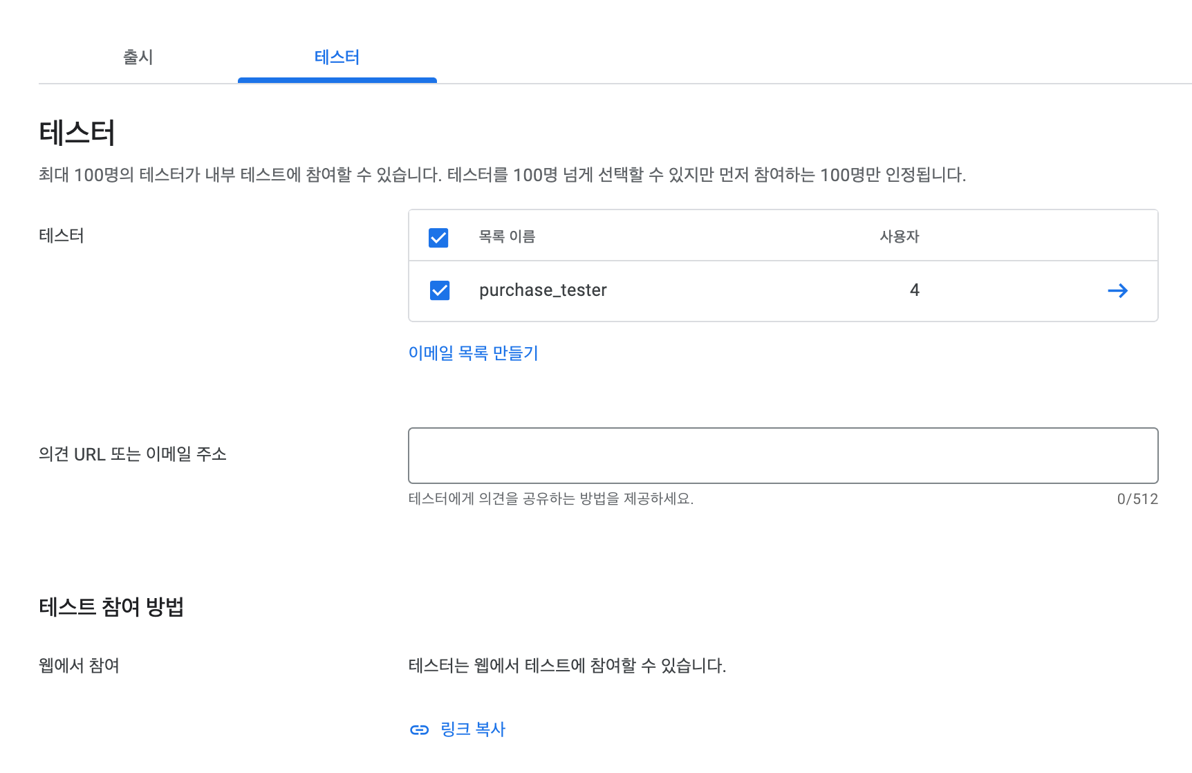 APK는 내부 테스트 > 새 버전 만들기를 통해서 내부 테스트에 올릴겁니다. 아까 만든 테스터 그룹을 지정해주고, "테스트 참여방법"의 링크를 복사하여 휴대폰을 통해 열면 내부 테스트에 접근이 가능합니다.