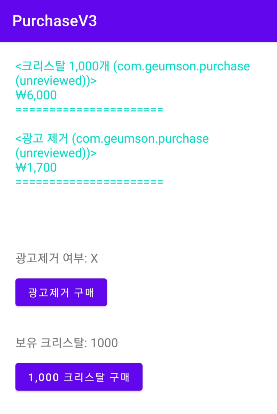 화면에서는 BillingModule이 초기화된 직후 불러와주면 제대로 적용됩니다. 구매여부 확인은 비 소비성 상품인 광고제거에만 필요하므로 그렇게 구현하였습니다.