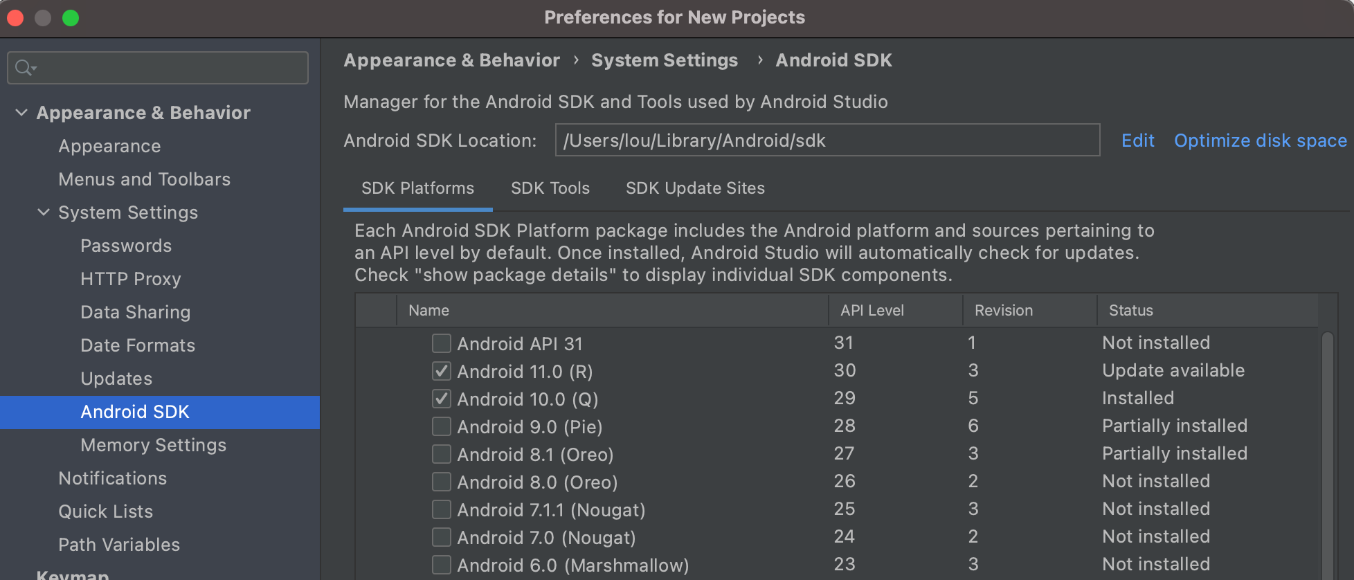 Android SDK 경로는 안드로이드 스튜디오에서 SDK Manager를 열면 손쉽게 확인할 수 있다.