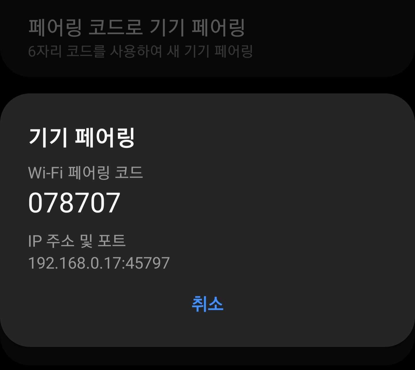 5. 이제 부터는 컴퓨터 키보드를 만질 시간~ 위 사진처럼 IP 주소 및 포트와 Wi-Fi 페어링 코드가 뜰 것이다. 컴퓨터 터미널에 해당 IP 주소와 포트를 조합하여 입력한다.