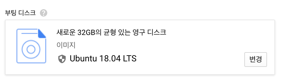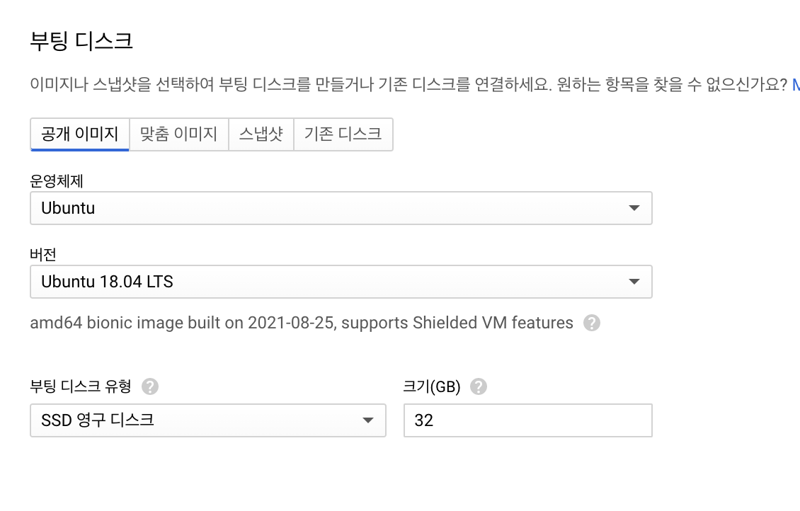 하단에는 부팅디스크유형이라고 크기와 디스크 유형을 설정하는 곳이있는데, SSD 영구디스크, 크기는 넉넉하게 32GB로 잡아줍니다. 얼만큼 계획해야 좋을지는 이 글을 참조 해 주세요.