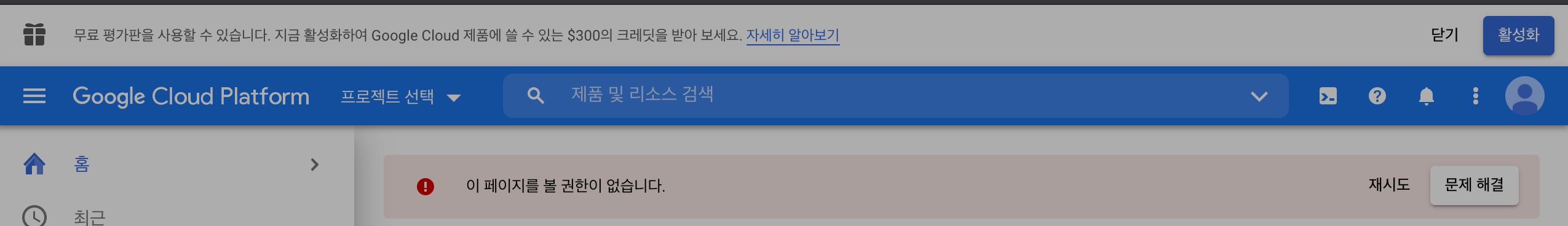 로그인 후 https://console.cloud.google.com 으로 이동하셔서 아래와 같이 무료 평가판을 사용할 수 있는지 확인 해 주세요.