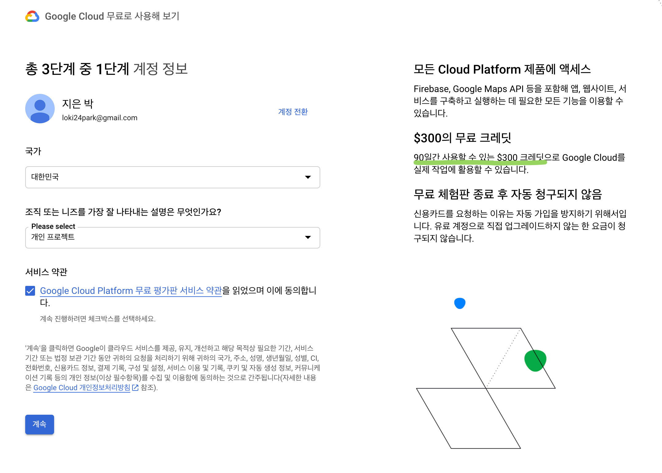 결제 정보를 등록해야합니다. 유료 계정으로 직접 업그레이드 하지 않는 이상 요금이 청구되지 않는다고 하지만 조심하면 좋죠~
