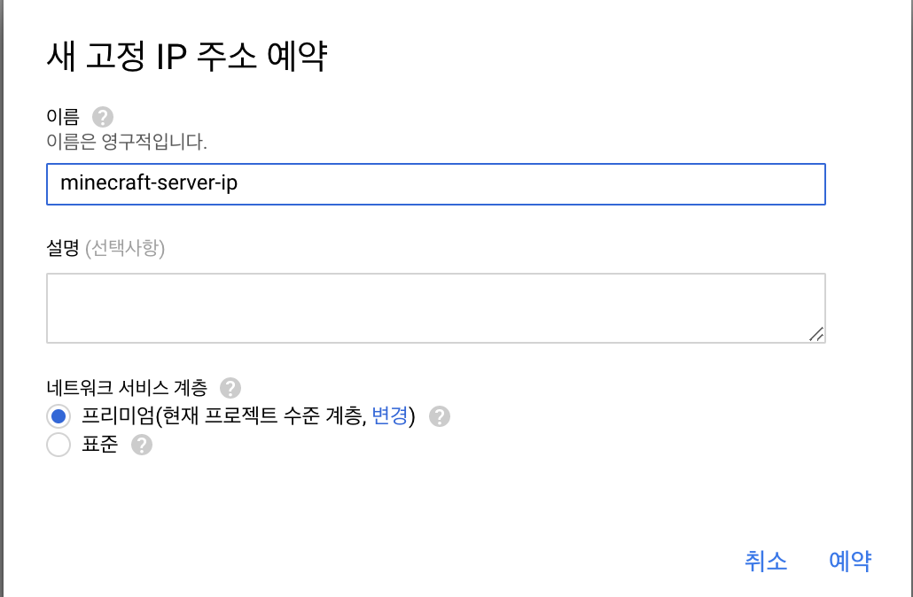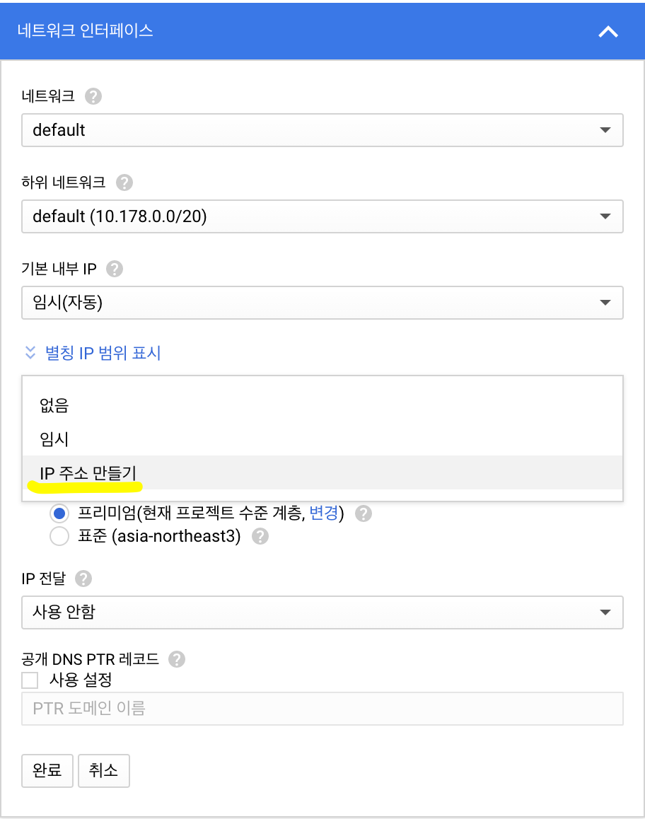 외부 IP는 기본적으로 임시라고 되어있을텐데, 그 부분을 클릭해서 IP 주소를 만들어줍니다.