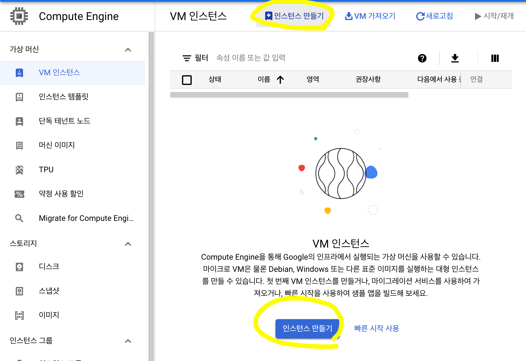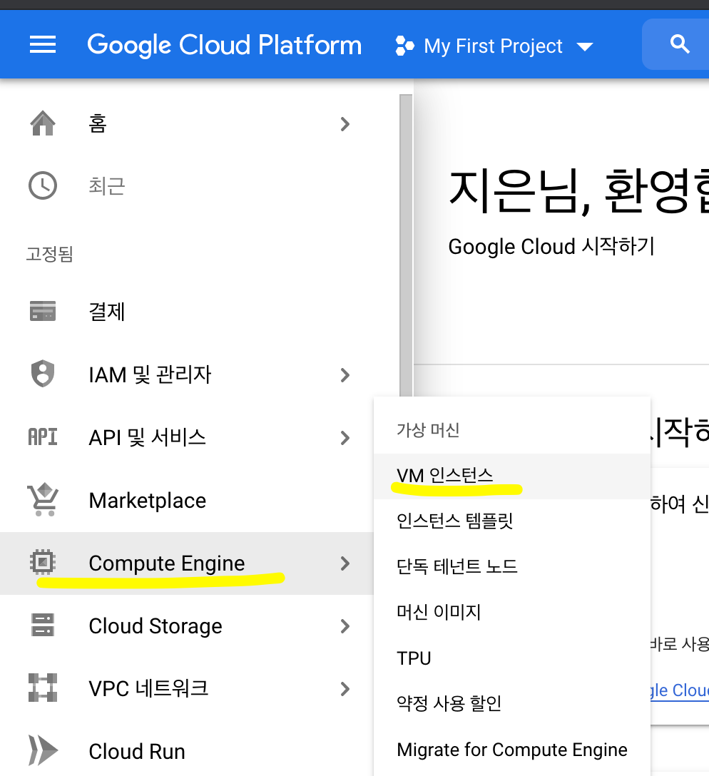 마인크래프트를 돌릴 가상 머신 서버를 생성하려고 합니다. 메뉴에서 Compute Engine > VM 인스턴스를 클릭하고,