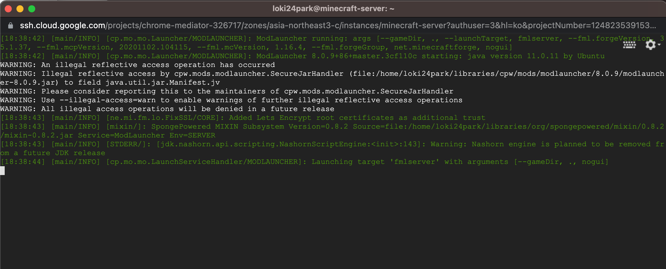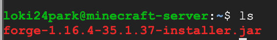 그러면 새로운 파일들이 생성될텐데 ls를 입력하면 forge-1.16.4-35.1.37.jar 라는 파일과 마인크래프트 어쩌고 자시고하는 jar 파일도 생성된것을 볼 수 있습니다.