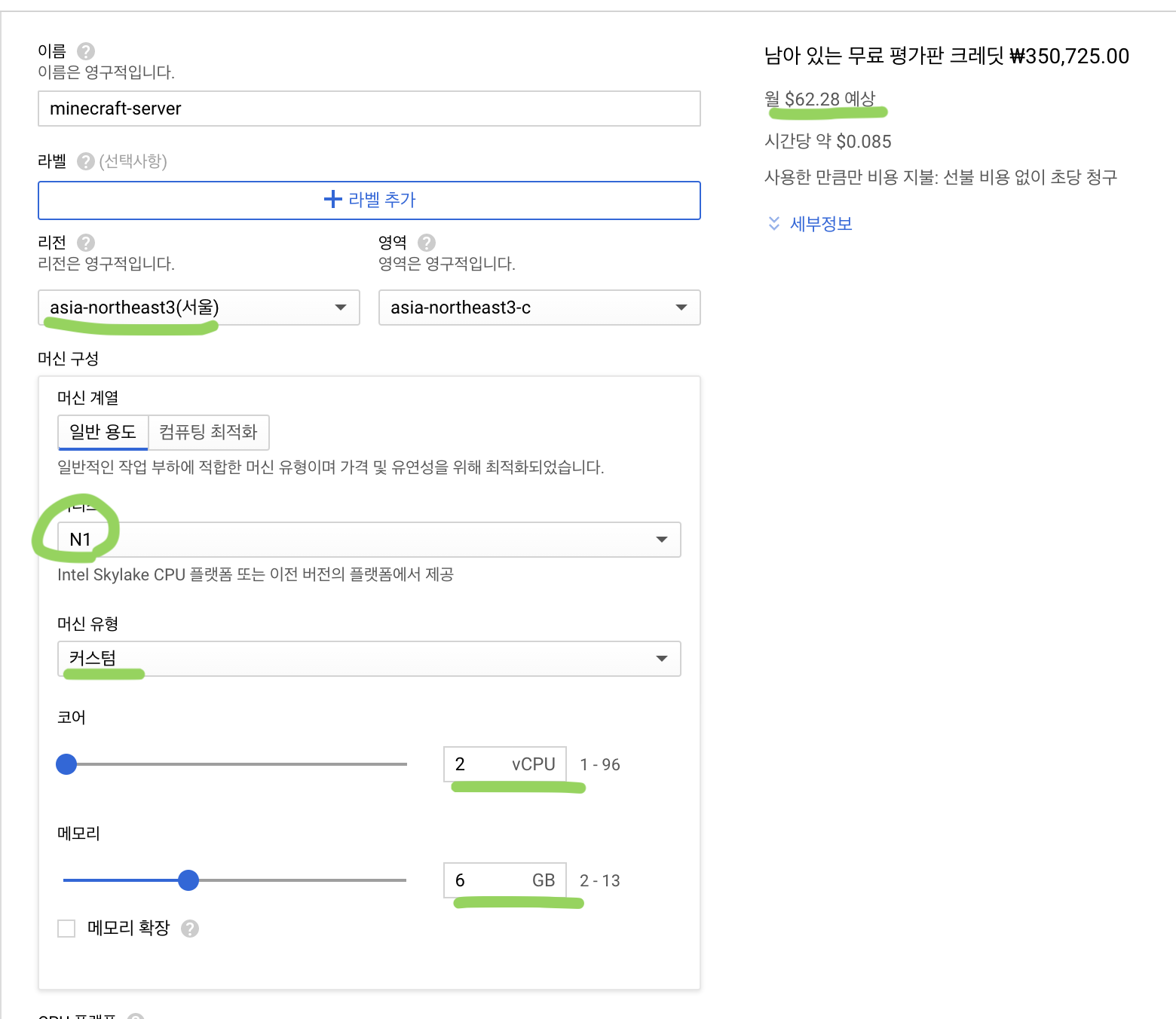 머신구성 - 머신유형: 커스텀을 해주었는데, 저는 10명정도 플레이할 서버를 기준으로 삼는다면 저정도도 적당합니다.