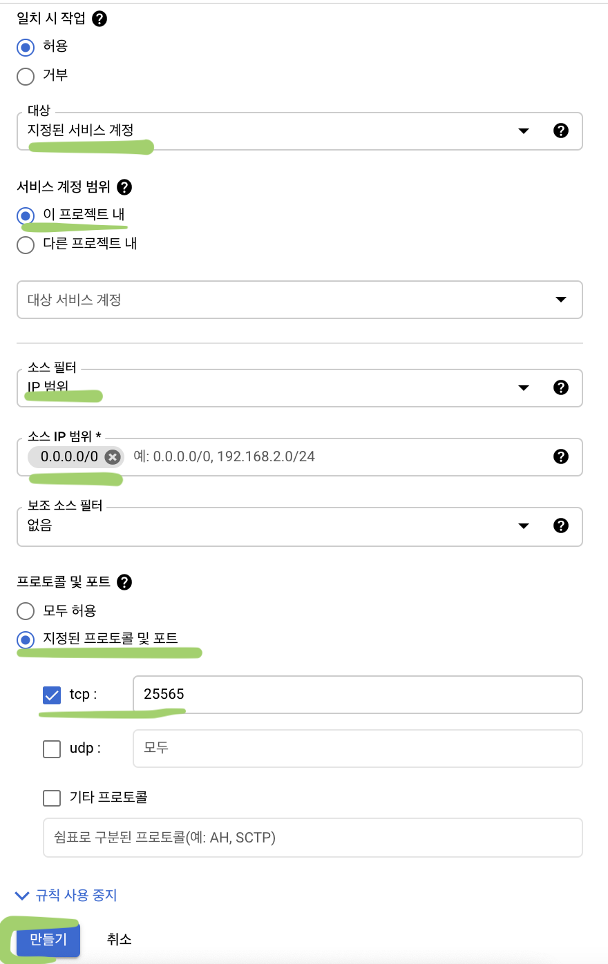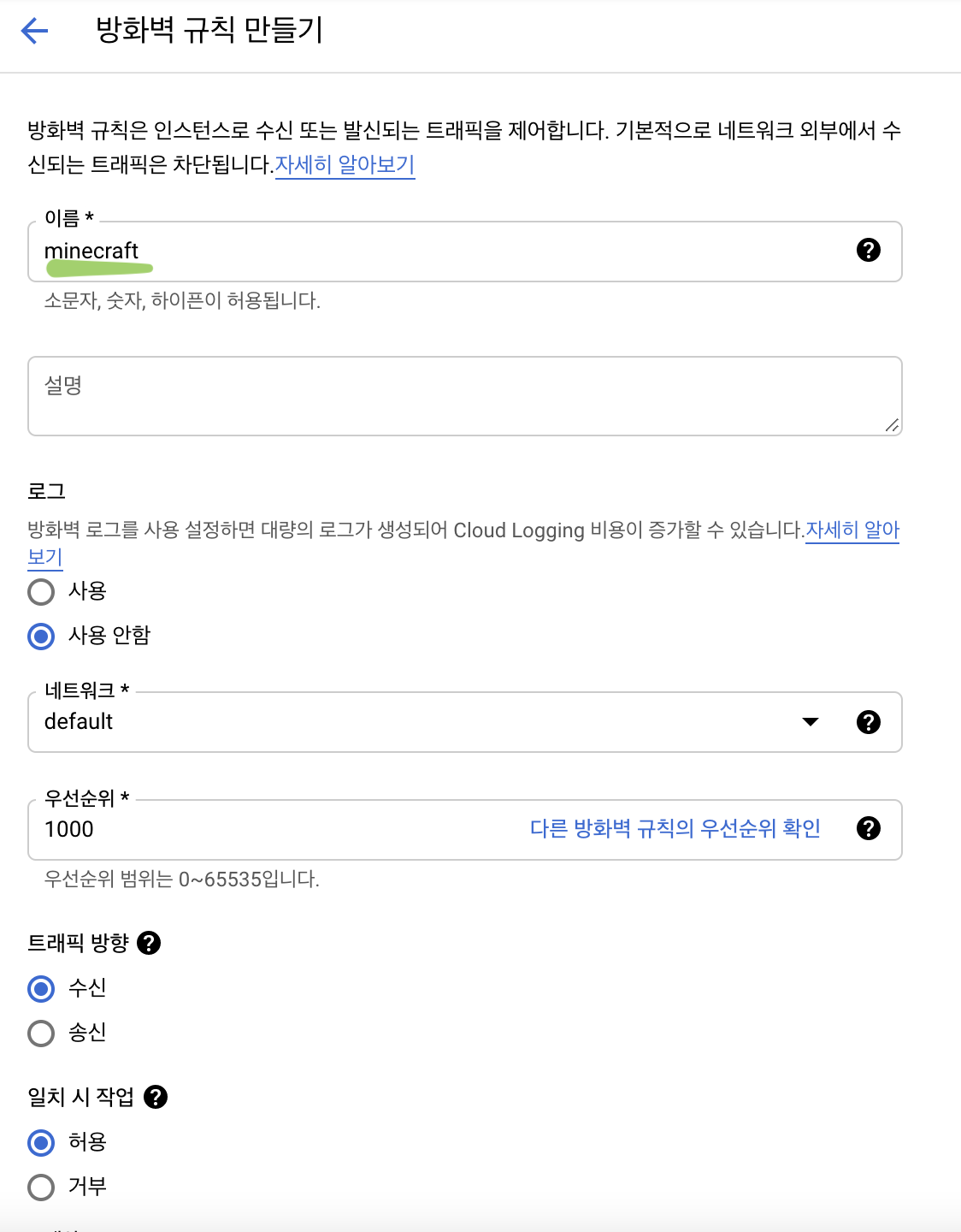 마인크래프트 포트로 외부에서 접속할 수 있게 방화벽 규칙을 설정해야 합니다. 복잡해 보일 수 있지만 사진과 똑같이 만든 후 만들기를 누릅니다!