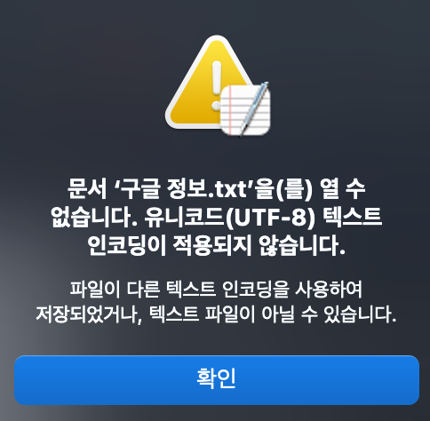 Windows에서 ANSI 인코딩으로 저장된 메모장 txt 파일을 맥에서 읽어들이려하면 다음과 같은 문구가 뜨면서 열리지 않을 것이다.