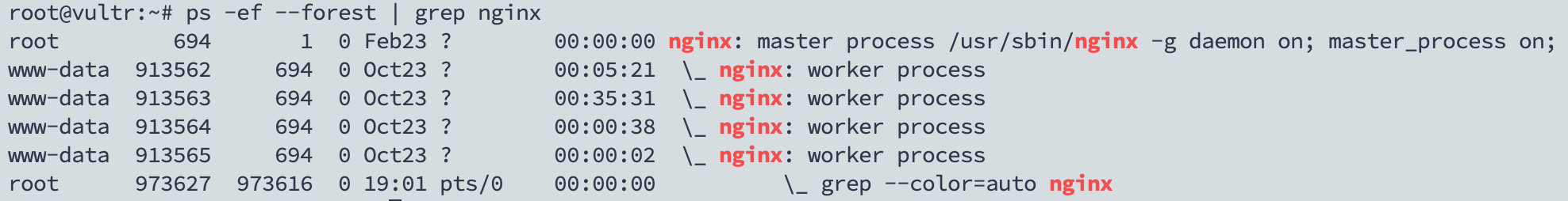 4코어를 가지고있는 내 서버에서 따로 Worker process를 정의해주지 않고 실행했는데 이렇게 4개의 Worker process들이 있는 것을 볼 수 있었다.