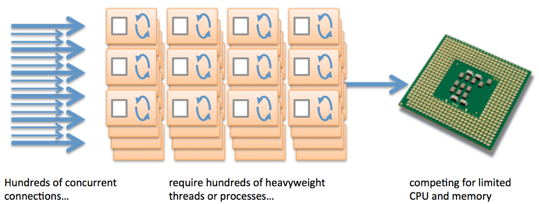 Apache 웹 서버는 Process-Driven 방식이다. Apache의 MPM(Multi-Processing Module)은 클라이언트에 요청이 많을 경우 그때마다 Process 또는 Thread를 생성하여 처리한다. 이같은 방식은 동시 접속 요청이 10,000개라면 그에 해당하는 Thread 생성 비용이 발생하게 되고, 시스템 자원이 고갈된다는 문제점이 있다.