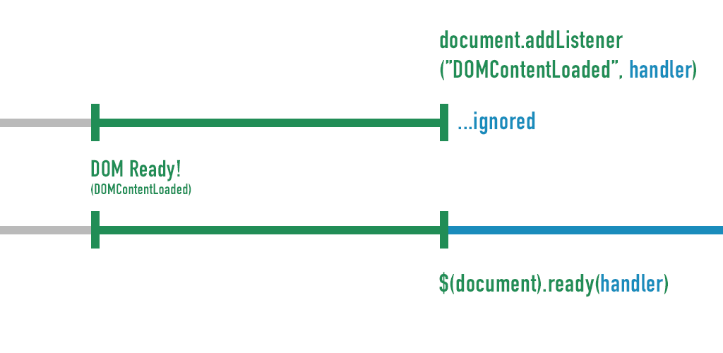반면에, ready()의 경우에는 이미 ready()를 호출하기 이전에 DOMContentLoaded 이벤트가 일어났더라도, ready안의 function이 호출된다.