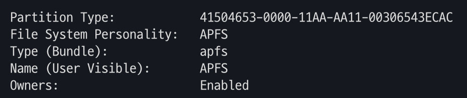 맥에서 diskutil info / 를 치면 현재 볼륨에 대한 파일 시스템 정보를 볼 수 있는데, APFS를 사용중임을 알 수 있다.