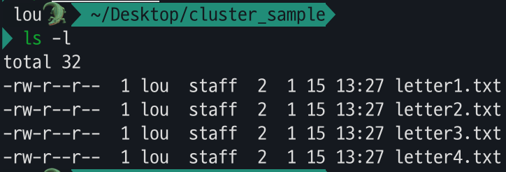 딱 한글자만 적어서 실제로 2B를 차지하는 텍스트 파일 4개를 만들어보았다. 이 4개의 파일은 cluster_sample이라는 디렉토리에 들어있는데, 외부에서 확인했을때 디렉토리의 크기는 8B가되어야 할 것이다. 하지만 실제로 확인해보면 크기는 8바이트이지만 디스크에서는 16KB를 차지하고 있다고 뜬다. 클러스터 크기에의해 단편화가 발생한 것이다.