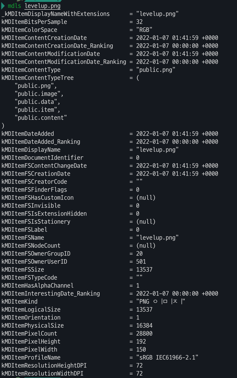 파일 시스템을 추상화해보면 메타 영역과 데이터 영역으로 나누어 볼 수 있다. 메타 영역은 파일 관리를 위한 파일의 이름, 크기, 생성일, 위치 등의 정보가 기록되어있는데, 이를 메타 데이터(meta-data)라고 한다. 파일 시스템은 이러한 메타 데이터를 바탕으로 파일을 관리하고 있다. 맥에서 mdls <파일명>을 치면 다음과 같이 파일의 메타 데이터를 볼 수 있다. (간략하게는 ls -l로 볼 수 있다.)