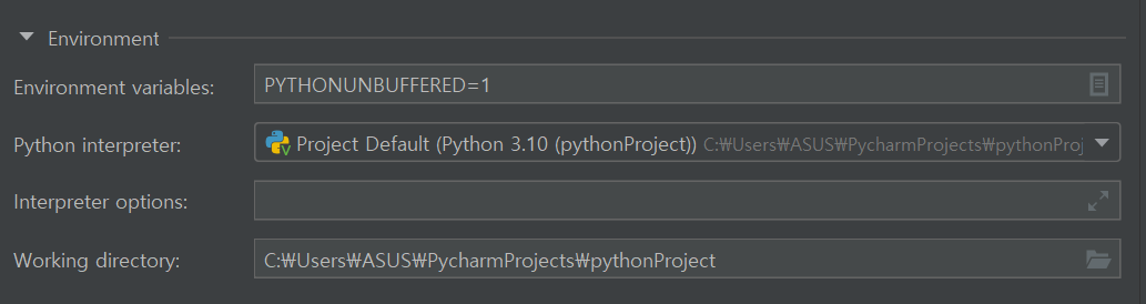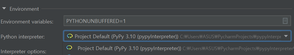 Pycharm에서 작성한 프로그램의 Run/Debug Configurations에보면 Python interpreter를 선택하는 부분이 있다. 작성한 Python코드가 어느 버전의 interpreter를 통해 실행 될 것인가를 설정하는 부분이다.