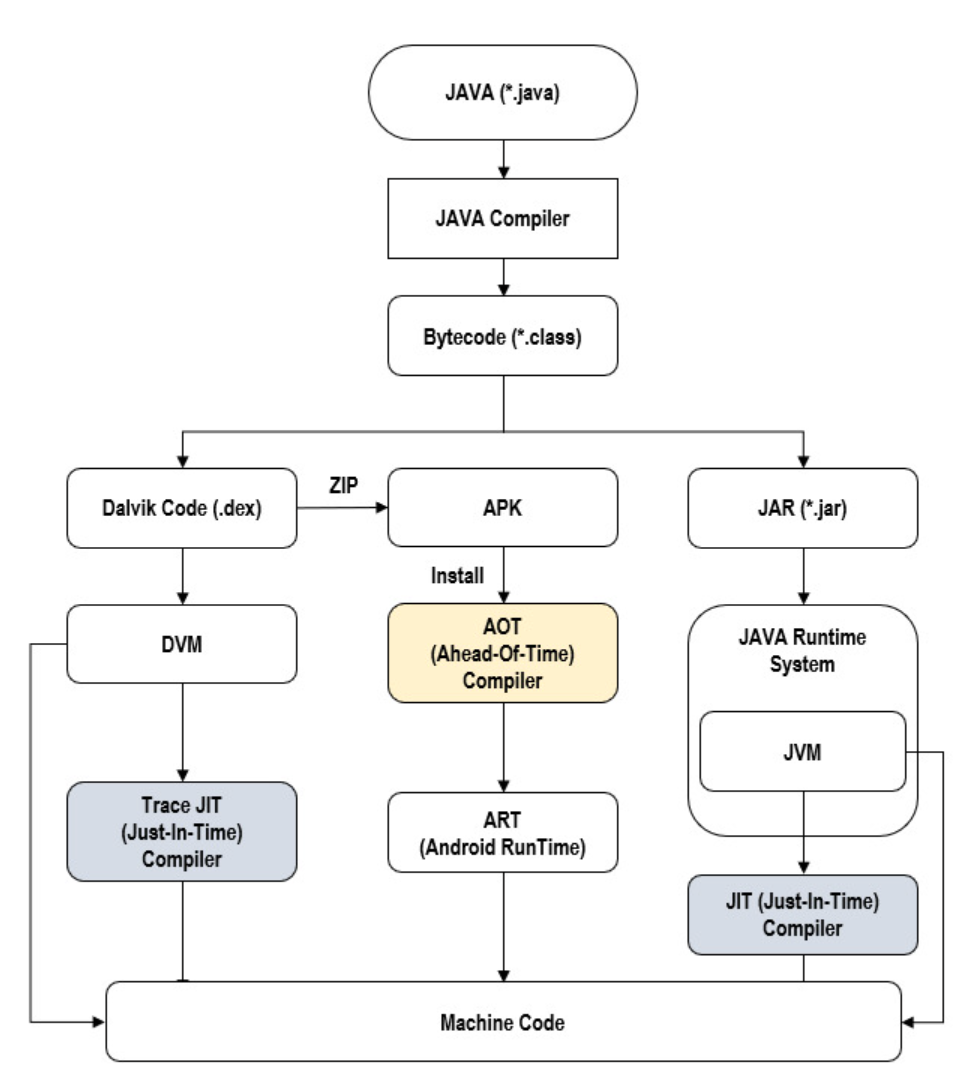 Dalvik의 내부 컴파일러가 바로 JIT이다. JIT의 특징을 보면 런타임의 퍼포먼스가 떨어진다는 부분이있는데, 이를 보완하기 위해서 AOT가 등장했다.