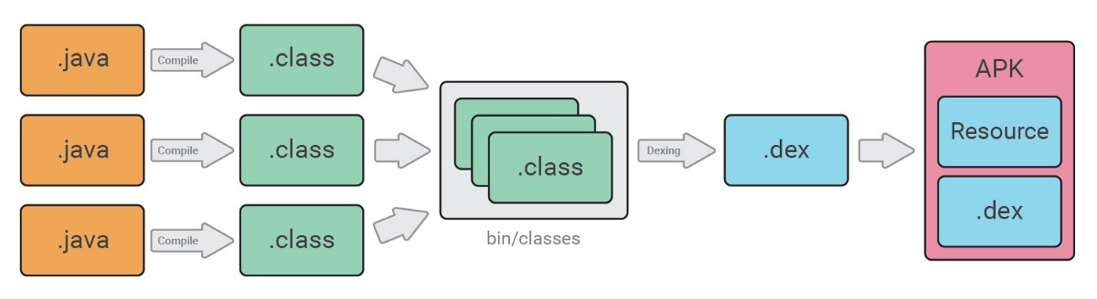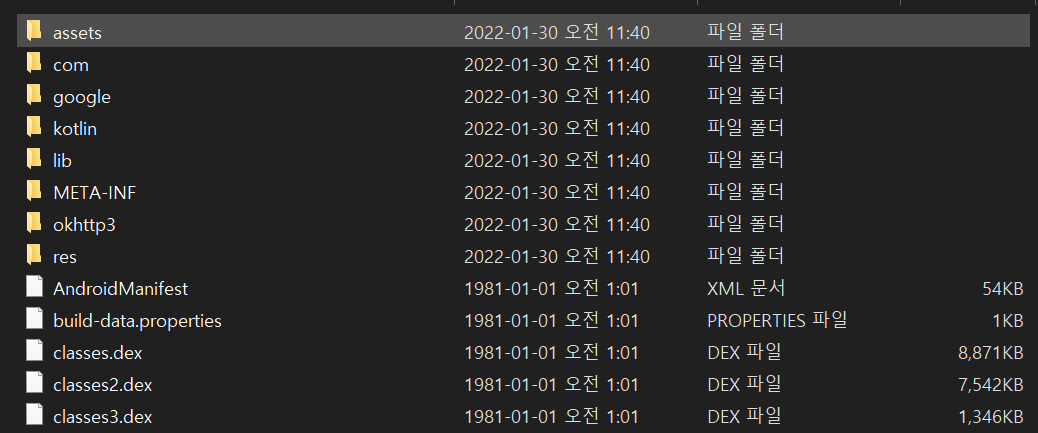 안드로이드 앱은 DVM (Dalvik Virtual Machine)이라는 가상 머신 위에서 실행된다. JVM과 비교해서 적은 리소스를 사용하여 열악한 모바일 환경에서도 잘작동하고, 라이센스 관련문제로 구글은 Dalvik을 선택했다고 한다. 아무튼 apk 파일을 압축해제해보면 위 사진처럼 classes.dex라는 파일들이 보일 것이다. 앞서 java파일은 class라는 바이트코드 파일 형식으로 컴파일된다고 했는데, dex는 DVM에서 실행가능한 class 파일의 묶음이다.