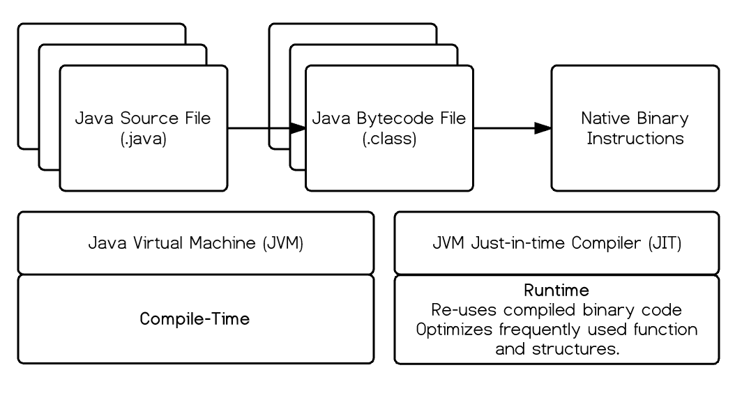 C는 직접 기계어를 생성했기 때문에 운영체제마다 다른 Object 파일을 생성해야하므로 컴파일을 각각 해주어야했지만, Java는 JVM이 읽을 수 있는 바이트 코드를 한번만 컴파일 한 뒤에, 각 JRE(Java runtime environment)가 설치된 운영체제의 JVM 위에서 실행시키기만 하면 되므로 WORA(Write Once Run Anywhere)를 실현시킬 수 있었다.