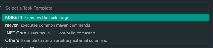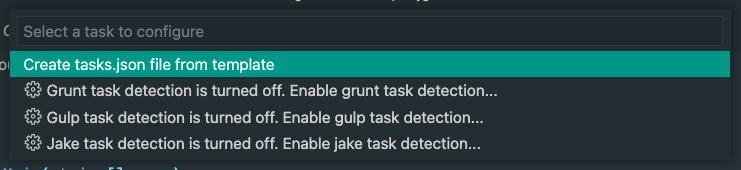 Terimal > Run Build Task를 누르면 아래처럼 Build Task가 없다고 하나 만들라고한다. 아래 버튼들을 차례로 클릭한다.