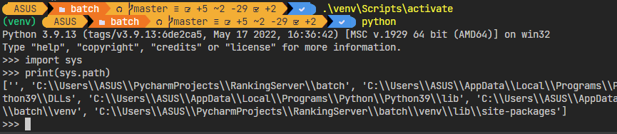 위 사진처럼 venv 환경안에서 sys.path를 조회해보면 제일 앞에 RankingServer\batch라고 나오는데, 이건 최종적으로 추가 된 것이고 원래는 이게 존재하지 않아 libs/tasks를 찾을 수 없었다.