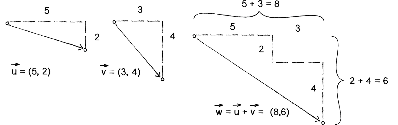 두 벡터 u = (5, 2), v = (3, 4)가 있다고하면 u + v = (8, 6)이다.