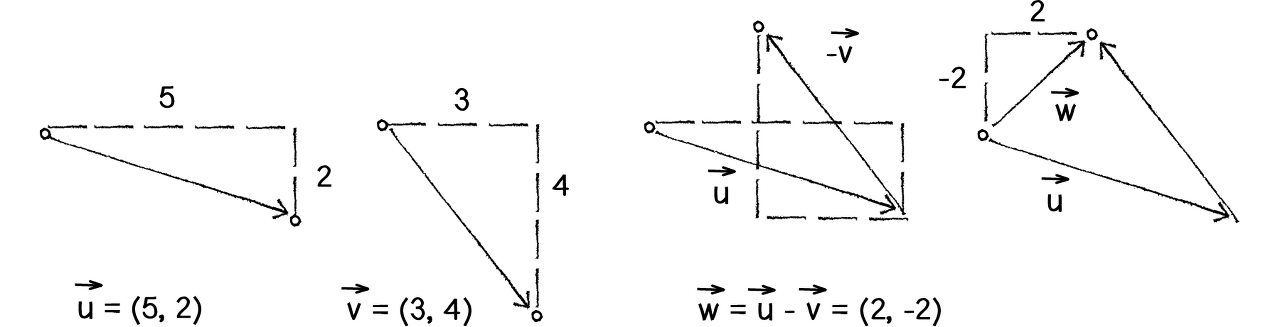 두 벡터 u = (5,2), v= (3,4)가 있을때 u - v = (2, -2)이다. 빼다보면 (0, 0)인 영벡터가 나올것인데, 영벡터는 크기도, 방향도 없는 벡터이다. 또, u = (5, 2)와 크기는 같지만 방향이 정 반대인 벡터를 역벡터라고 한다.