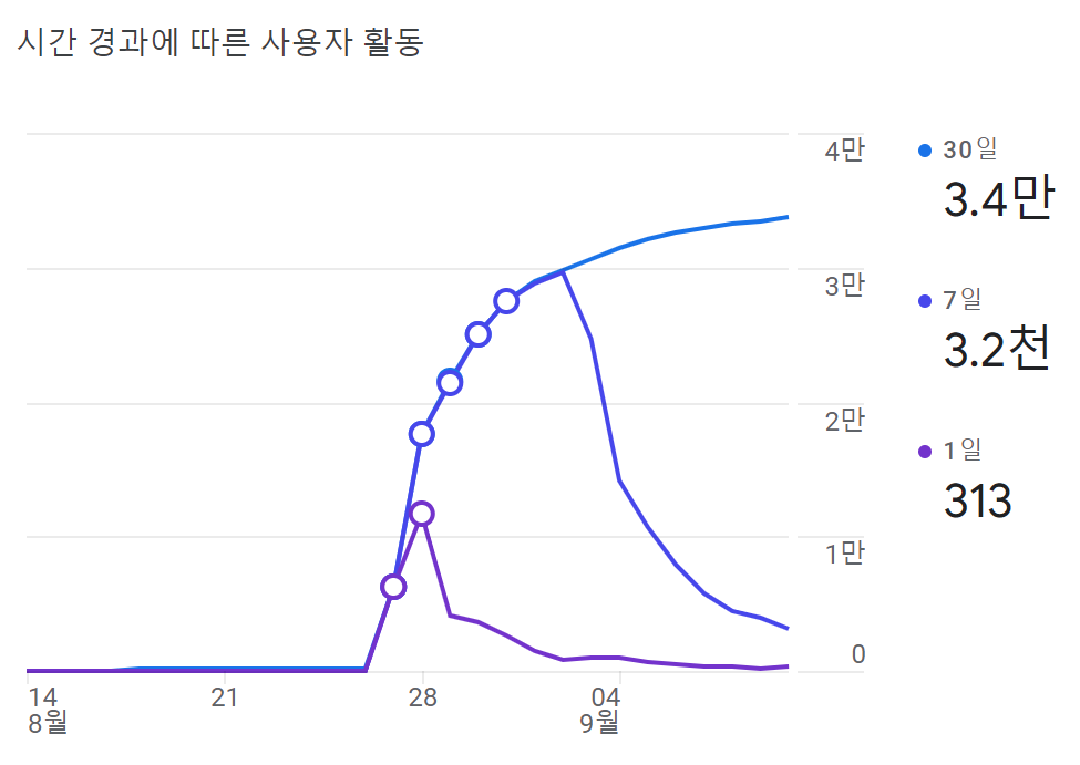 기대를 아주 죽여놔서인지, 성적은 기대를 넘어섰다. 유튜브로도 홍보하기도 했고, 트위터에서 한바탕 입소문이 나서 거의 동접 800까지도 봤다. 출시 이튿날이 피크였는데, DAU 1.2만 정도가 나왔다. 트위터에 자주들어가서 사람들의 반응을 지켜보는 것이 그 날의 재미였다.