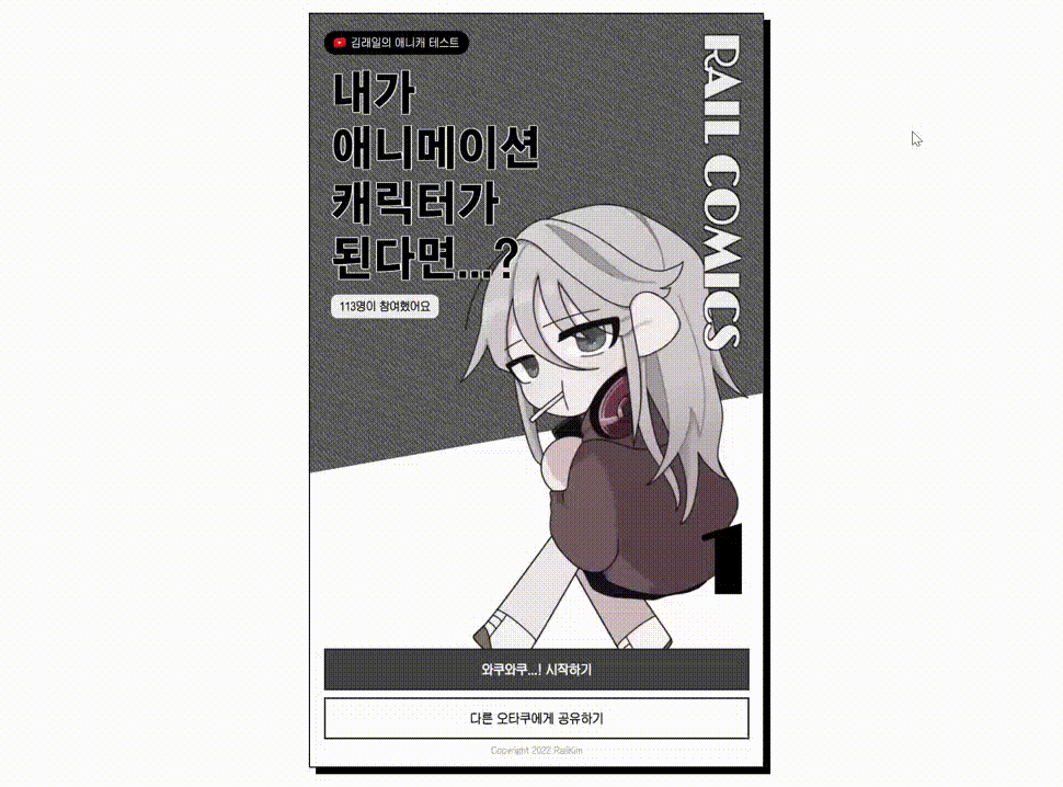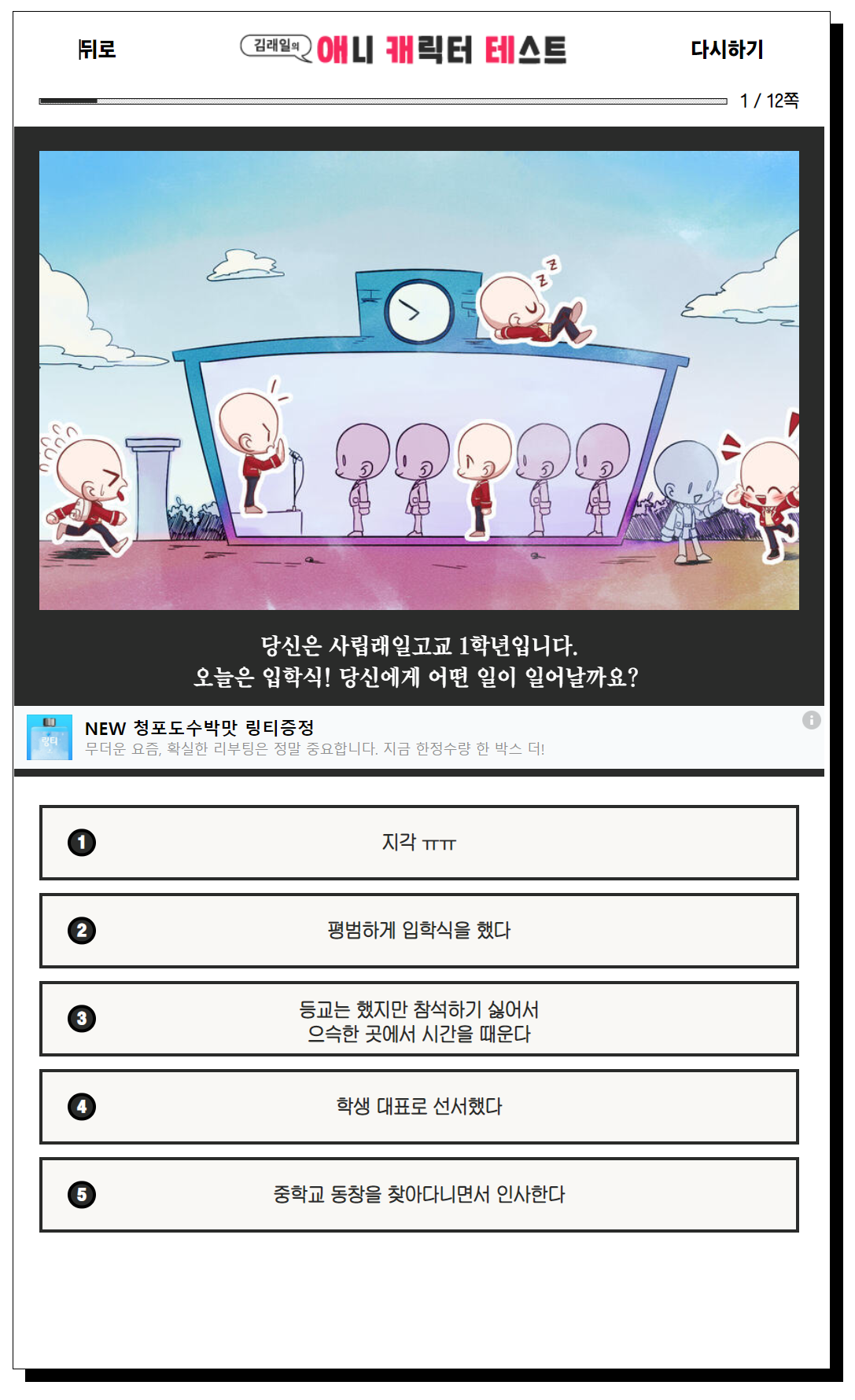 - 새로운 심리테스트 포맷: 요즘 심리테스트들이 달라지기 시작했다. 카카오톡 대화형도 생기고, 게임처럼 소리도 나고 오브젝트가 움직인다. 아마 기존의 심리테스트가 슬슬 안먹히기 시작했다는 증거일 것이며, 고민 끝에 나온 방법이었을 것이라는 생각이든다.