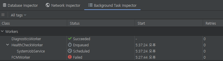 AndroidStudio의 App Inspector > Background Task Inspector에서 현재 돌아가고있는 Background Task 목록과 상태를 확인할 수 있다. 하지만 사진처럼 Status가 Failed가 떴을때는 정확한 원인을 진단하기가 힘든데, 이때 Worker에 생긴일을 디버깅하는 방법을 소개한다.