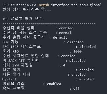 2. "netsh interface tcp show global"을 입력한다.
