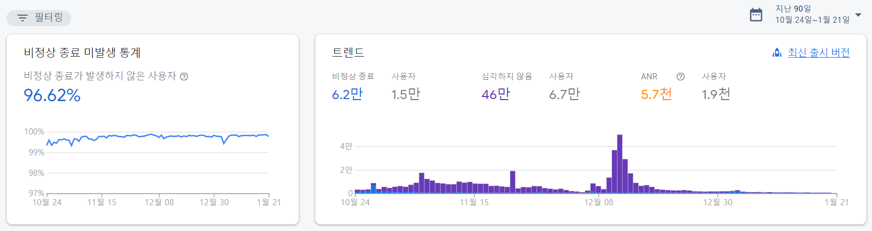이건 Firebase Crashlytics 통계인데 지난 90일간 통계를 보면 비정상 종료 미발생률이 96.62%로 보인다. (12월초 통계는 외부적 요인에 의한것…) 물론 개발중인 버전 포함한 수치이긴하지만 거의 4%가 크래시라는건데 굉장히 큰 수치다. 버그가 나면 무조건 안드로이드 팀부터 의심을 받았다. ㅋㅋㅋ 그도 그럴 것이… 대부분 안드로이드의 문제가 맞았으니까.