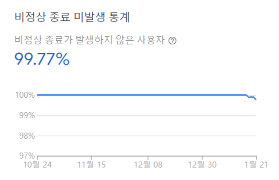 안드로이드 팀을 내가 리드하고 있다보니 진짜 개발 그만둬야하나라는 생각까지 갔다. 다른 앱은 어떤데? 첫 회사이다보니 다른 회사들의 사정을 몰랐다. 그러다 안드로이드 개발자 단톡방에서 비정상 종료 미발생 통계 KPI를 뭘로 잡냐는 말이 나왔는데, 99.5%라고 누군가 대답했다. 당시 우리 앱에서는 “그게 돼?”하는 수치였지만 나도 이 99.5%를 목표로 달려가겠다고 다짐했다.