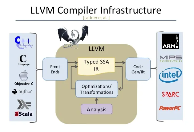 - High-Level 언어들을 파싱하여 IR로 만들고, IR을가지고 타겟 CPU에 맞는 Machine Code를 생성