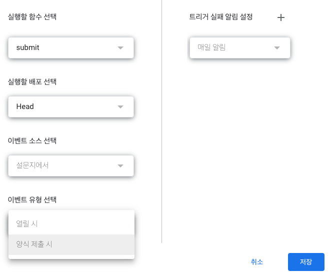 AppsScript 트리거 탭에 들어가서 트리거 추가를 누르면, 설문지 양식을 열때나 양식을 제출할때 실행할 함수를 설정할 수 있는데, 방금 작성했던 submit 함수를 연결시켜서 저장해준다. [저장]을 눌러 트리거를 세팅해두면 완성이다.