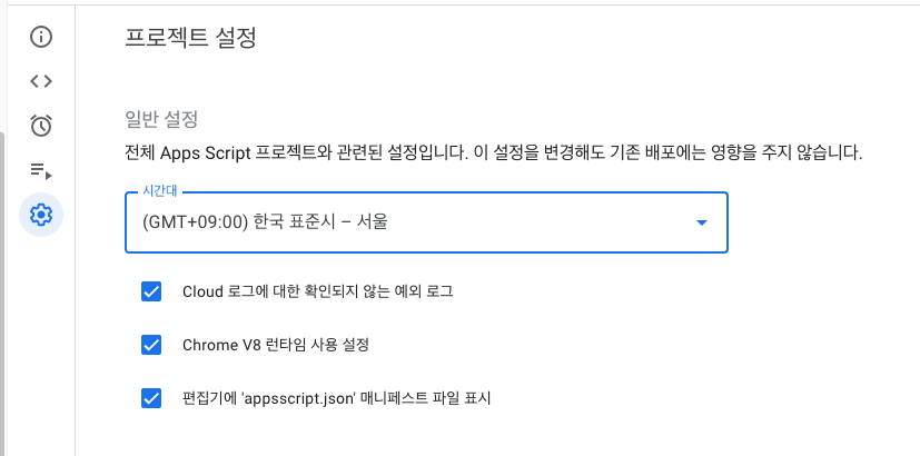 프로젝트 설정 > 편집기에 [appsscript.json 매니페스트 파일 표시] 체크를 하면 편집기에서 appsscript.json이 생긴 것을 볼 수 있을 것이다.