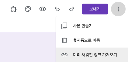 그런다음 더보기 메뉴에서 [미리 채워진 링크 가져오기]를 클릭, 이동한 페이지에서 링크 복사하기를 눌러 링크를 복사하게 되면 다음과 같이 설문지 URL뒤에 entry.<ID> Query Parameter 키가 생길것이다.