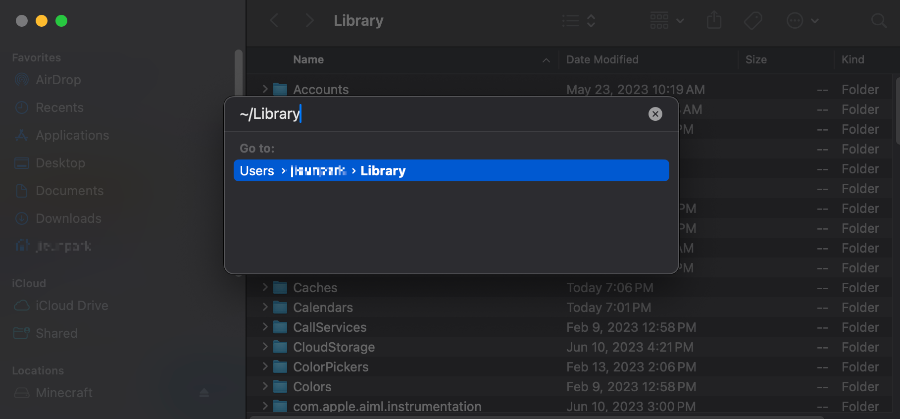 Finder를 열고 Command + Shift + G를 누르고 ~/Library를 입력해서 Library로 이동한다.