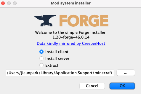 그러면 이렇게 Mod system installer 창이 뜨는데, Install Client 설치체크해서 OK를 누른다.